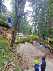 मसूरी:-कैमल बैक रोड पर संत निरंकारी मिशन व कब्रिस्तान के समीप गत रात्रि एक विशाल बांज का पेड़ गिर गया जिसके कारण संत निंरकारी मिशन क्षेत्र में विद्युत आपूर्ति बाधित हो गई। जिसके कारण बीस घंटे इस क्षेत्र में बिजली न होने से स्थानीय निवासियों को परेशानी का सामना करना पड़ा। दोपहर बाद विद्युत की आपूर्ति सुनिश्चित की गई।
